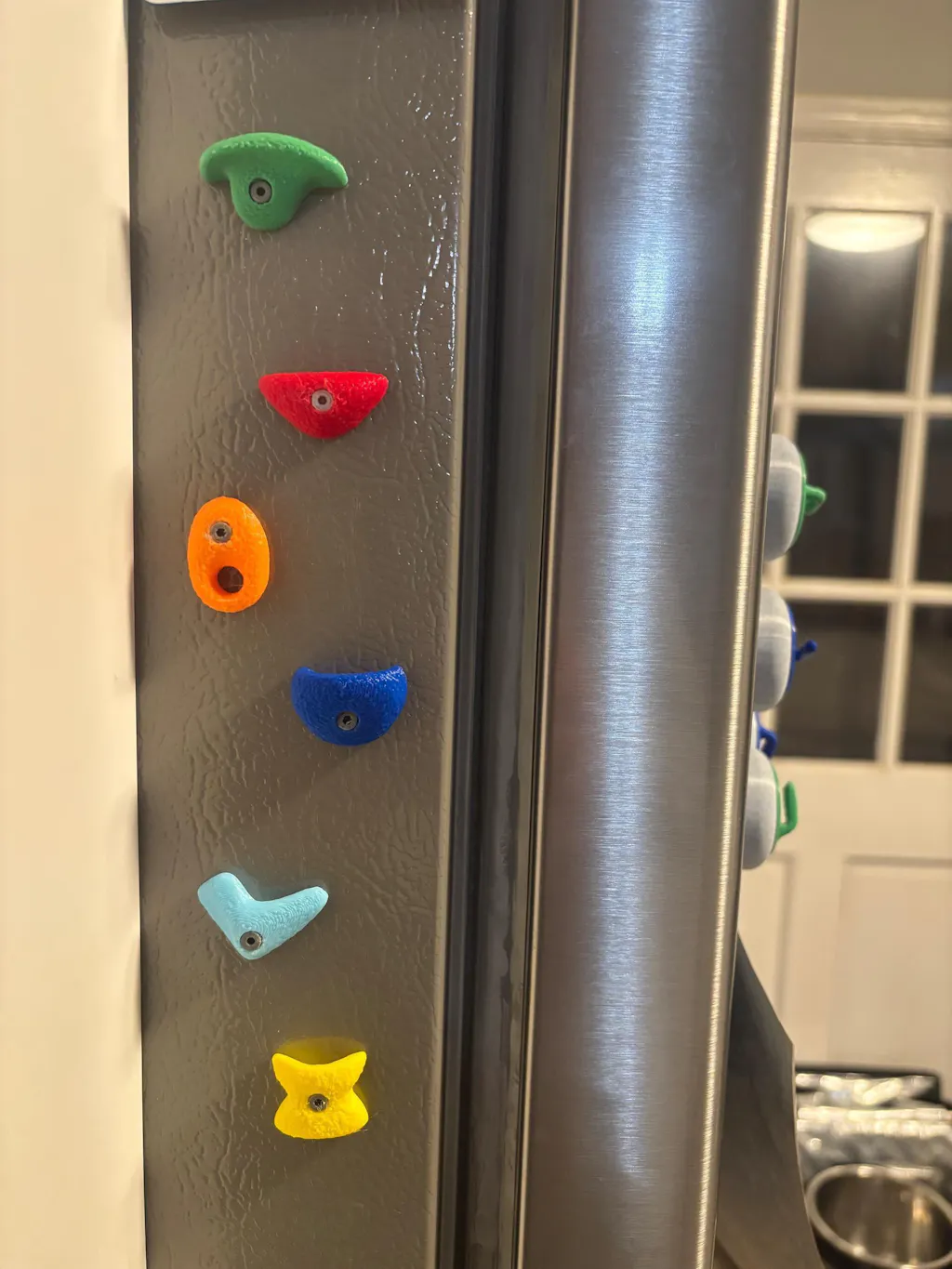 These 6 tiny bouldering hold magnets look like the real thing — and they actually work. Stick them on any magnetic surface to hold photos, notes, recipes, or just to make your kitchen way more interesting. Each hold has a strong embedded magnet with real holding power. No sliding.